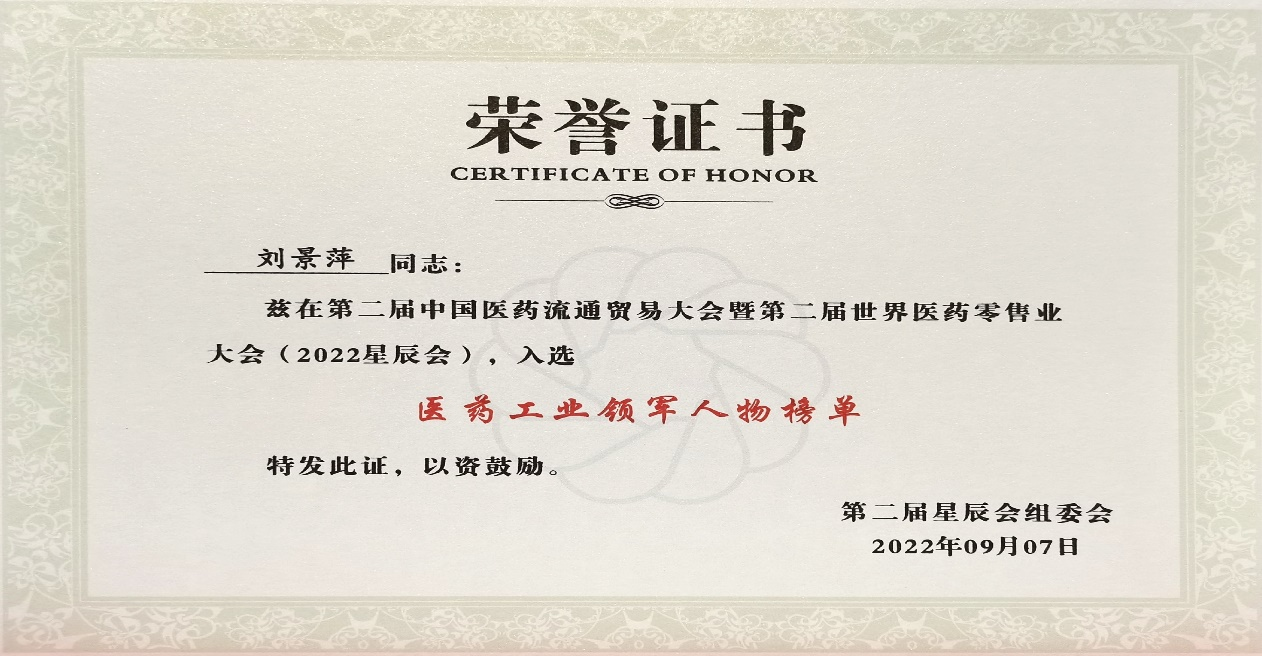 本次星辰会期间,佰富彩斩获颇丰,获得多项行业奖项及荣誉。在开幕式上,刘景萍董事长荣获“医药工业领军人物”称号。